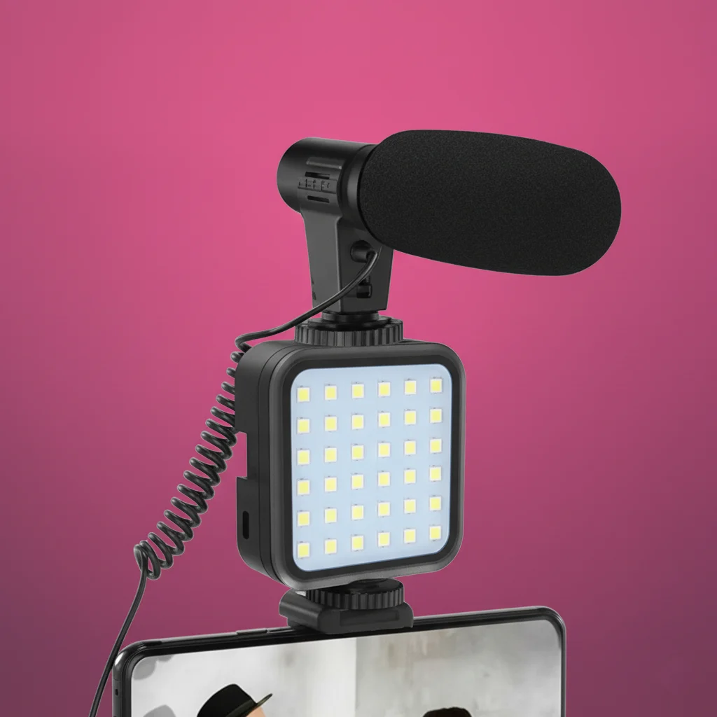 • All-in-One Vlogging Kit — This complete setup includes a microphone, LED light, and tripod so you can start recording professional-looking videos without needing extra accessories.